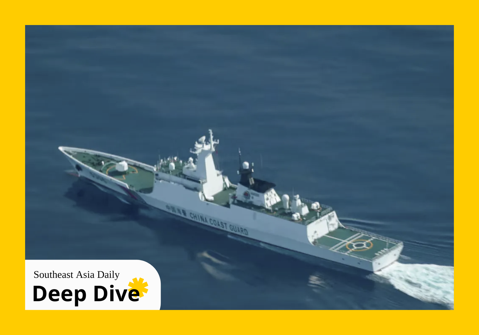 An aerial view of a China Coast Guard ship navigating near the disputed Scarborough Shoal,…
